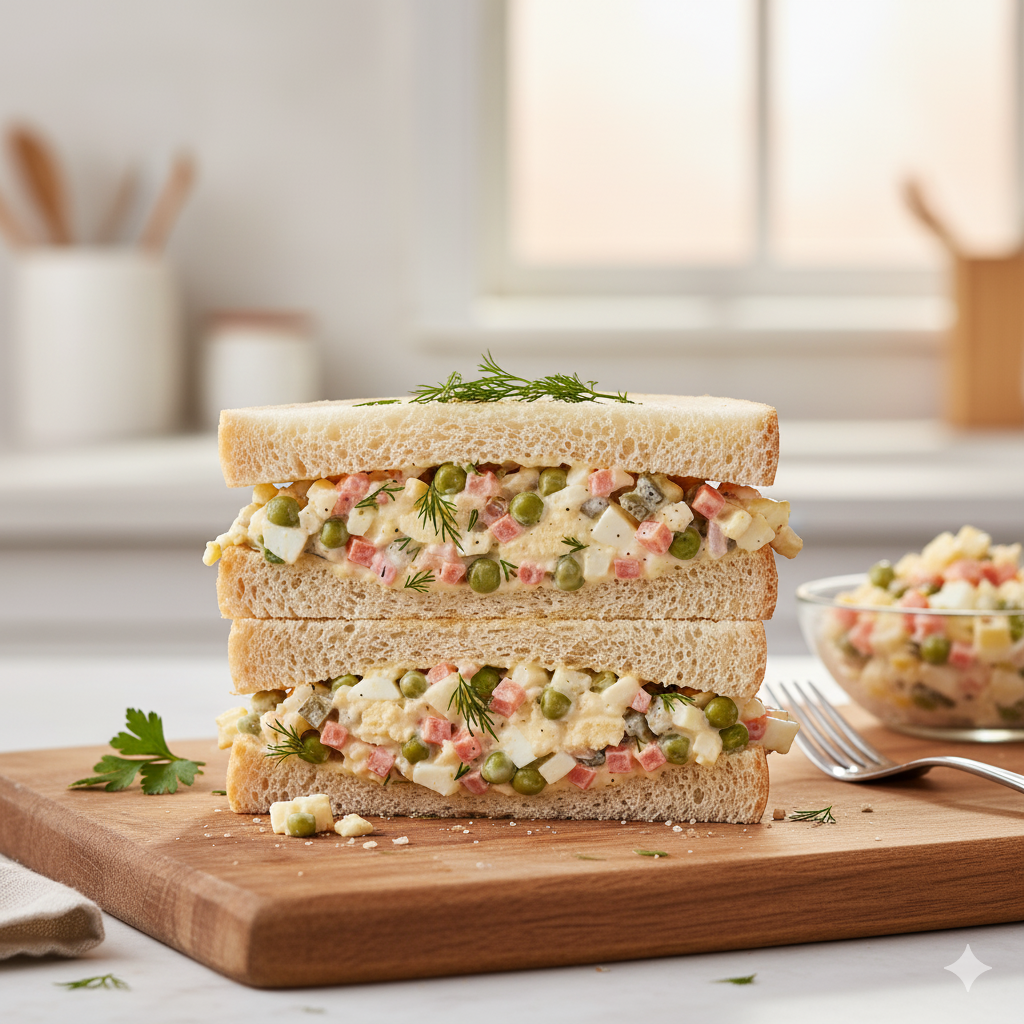 A rich and creamy sandwich filled with a medley of finely chopped vegetables in a mayonnaise-based sauce.